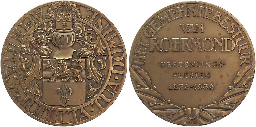 1932 Roermond 700 jaar. Gehelmd wapen van Roermond. / Op- en omschrift.Æ 60. (E. Lücker). Licht opgewreven en vlekjes keerzijde. Prachtig.