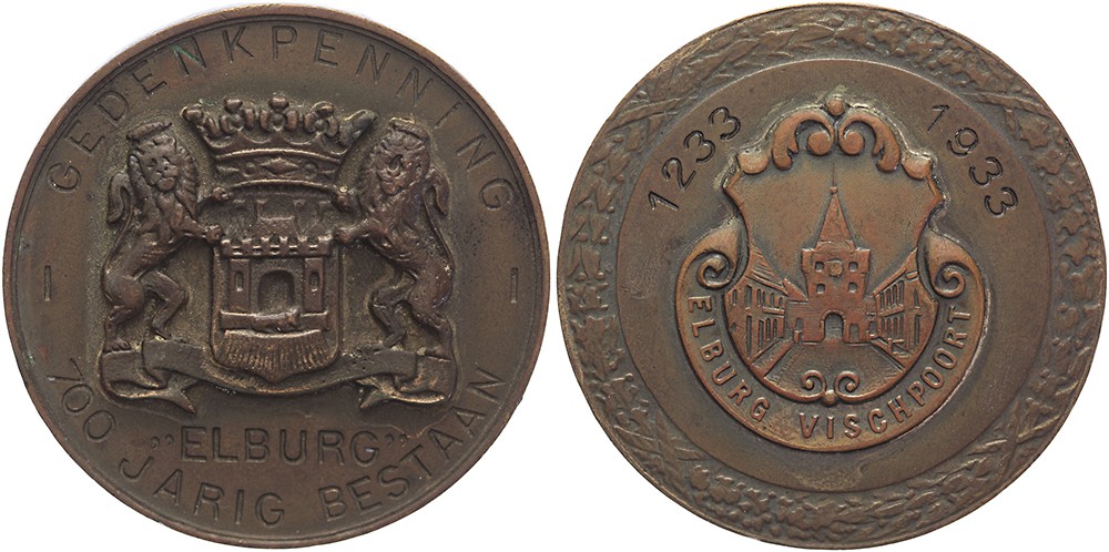 1933 Elburg 700 jaar. Gekroond wapen van Elburg gehouden door twee leeuwen. / Gezicht op de Vispoort. Æ 40,3. Prachtig.