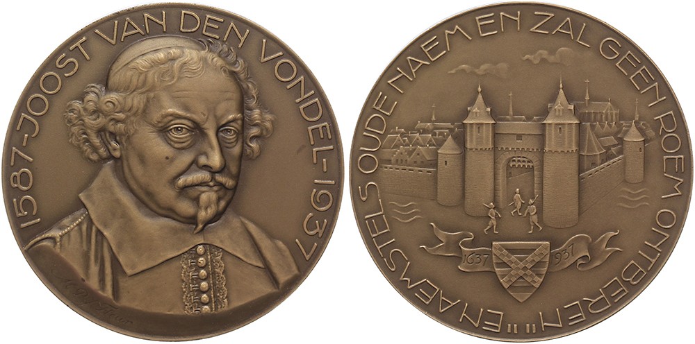 1937 Joost van den Vondel; 300e opvoering ‘Gysbregt van Aemstel’. Borstbeeld van Van den Vondel naar rechts. / Stadspoort en wallen van Amsterdam.Æ 60. KB V-1114. M.P.J. Fleur & (J.J. van Goor). Prachtig.