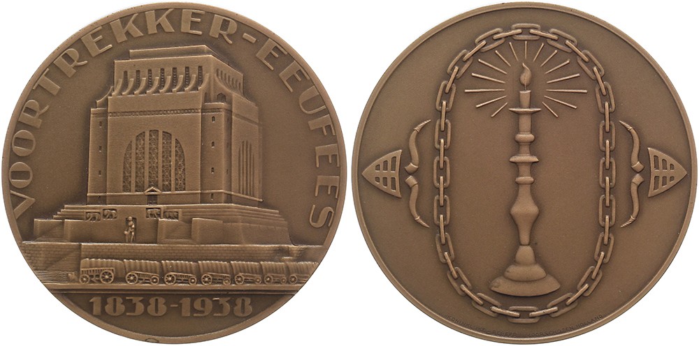 1938 Voortrekker eeuwfeest in Zuid-Afrika. Zeven uitgespannen ossenwagens voor monument. / Kandelaar binnen ketting, ossenhoornen en kafferschilden. Æ 60. KB V-1226. (M.P.J. Fleur). Prachtig.