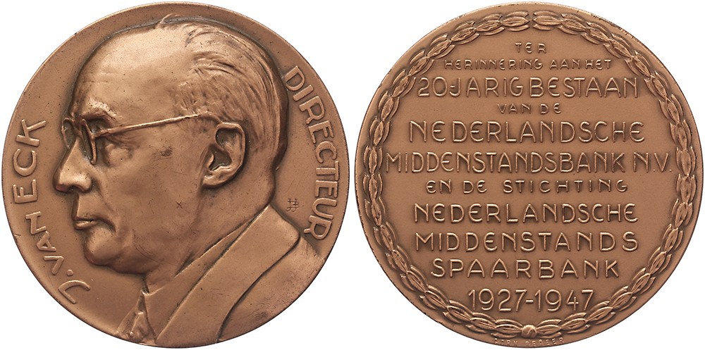 1947 20 Jaar Nederlandsche Middenstandsbank N.V. Borstbeeld Johan van Eck naar links. / Elfregelig opschrift. Æ 60. J.J. Both. Prachtig.