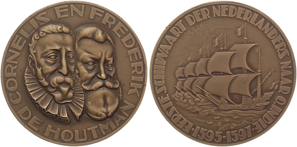 (1950) Amsterdam. Reis Cornelis & Frederik de Houtman naar Indië. Dubbelportret van de gebroeders De Houtman. / Vier zeilschepen tussen Schreierstoren en rede van Bantam.Æ 65. KB V-1877. J.C. Hekman & (J.Ph. van Zegveld). Prachtig.