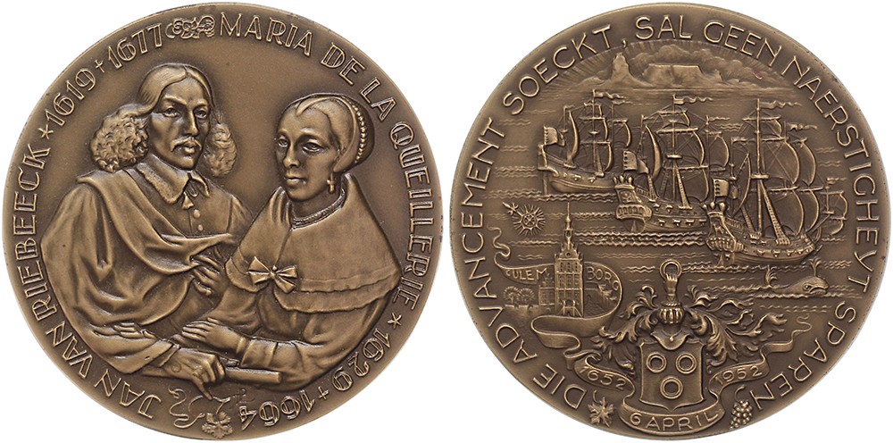 1952 Jan van Riebeeck 1652-1952. Dubbelportret van Jan en zijn vrouw Maria de Queillerie. / Schepen in de Tafelbaai. Æ 60. KB V-2004. Maarten Pauw. Prachtig.