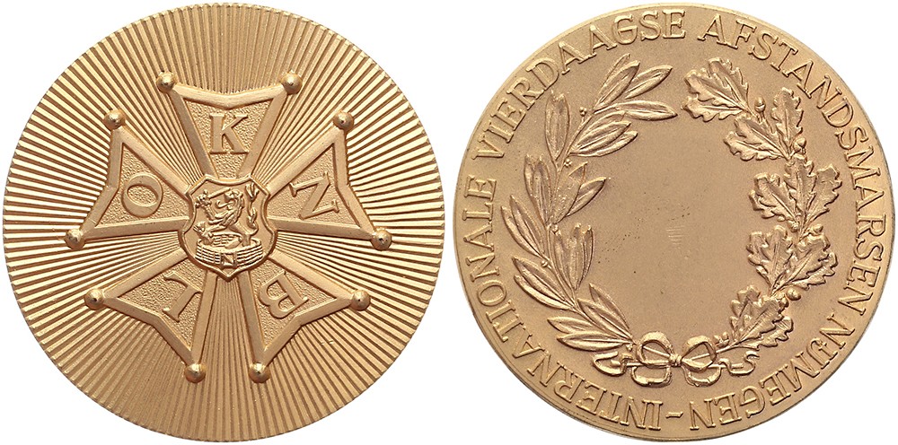 (± 1960) Nijmegen. Groepsmedaille KNBLO-Vierdaagse. Vijfarmig kruis op een font van stralen. / Inscriptieruimte binnen gestrikte eiken- en lauwertak.Æ verguld 49,6. Niet vaak voorkomend. Prachtig / FDC.
