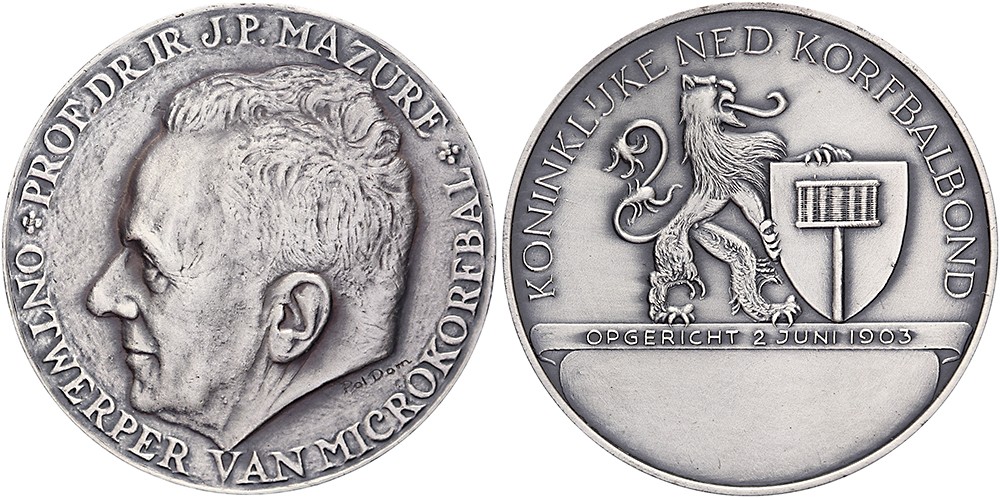(1969) Prijspenning Koninklijke Nederlandsche Korfbalbond. Hoofd Prof. Ir. J.P. Mazure naar links. / Inscriptieruimte onder wapenschild KNKB gehouden door een leeuw.Æ verzilverd 40. KB VI-3492. Pol Dom & (Han Wetselaar). In origineel doosje Begeer. FDC.