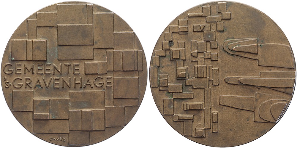 (1969) Den Haag. Gemeentelijke erepenning. Rechthoekjes rondom gemeentenaam. / Diverse rechthoekjes in hoogte verschillend. Æ 71. KB VI-3553. Jan Snoeck. Vlekjes. Prachtig.