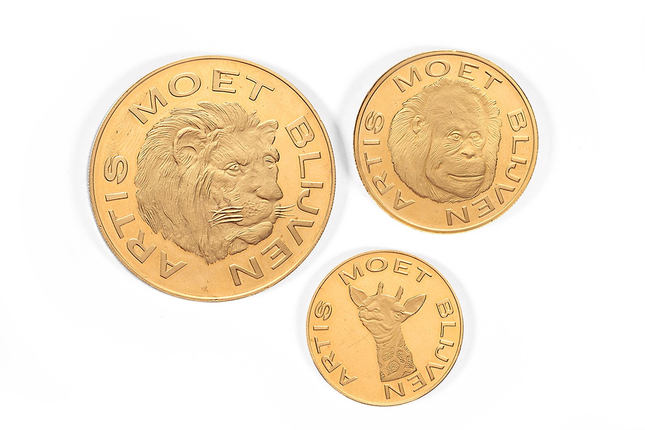 Lot (3)1970 Amsterdam. Gouden steunpenningen ‘Artis Moet Blijven’. Gekroond stadswapen geflankeerd door gedeeld jaartal en waarde. Eregulden met giraffe; ererijksdaalder met orang-oetan; eretientje met leeuw. AU 25 – 30,3 – en 40,6 mm. Bruto totaal gewicht: 57,48 gram. Prachtig / FDC.