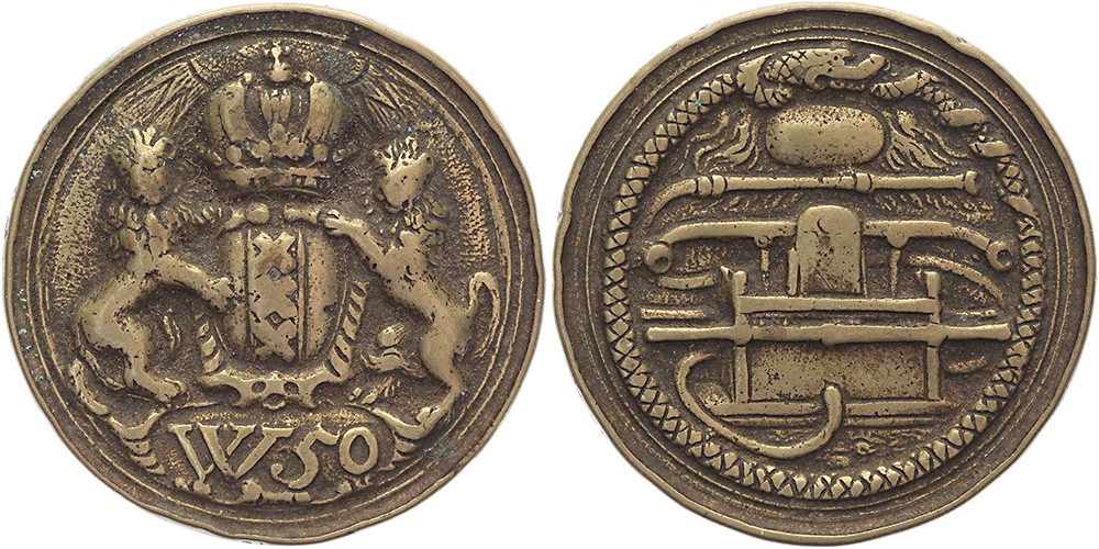 z.j. Brandspuitpenning Wijk 50, Nº —. Messing gegoten 43. Dirks plaat III-26; Minard II-120. Zeer fraai.