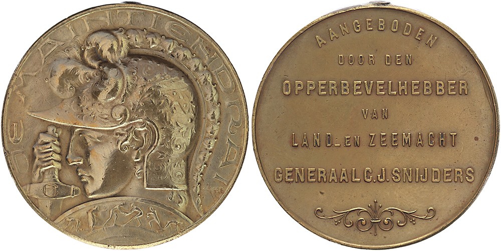 1916 Prijspenning opperbevelhebber Land- en Zeemacht I. Hoofd van Mars met schild en zwaard naar links. / Zesregelig opschrift.Æ 40,9. KB I-1226; Jintes/Pol 28. Afgehaald draagoog en gepoetst. Prachtig.