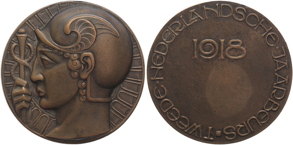 1918 Utrecht. Tweede Nederlandsche Jaarbeurs. Mercuriushoofd naar links. / Inscriptieruimte onder jaartal. Æ gegoten 84,5. KB I-1289; Jintes/Pol 37. Ovale verkleuring keerzijde, overigens prachtig.
