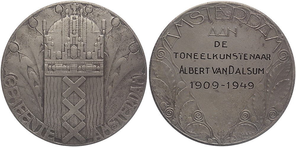 (1922) Amsterdam. Gemeentelijke erepenning. Gekroond gestileerd stadwapen tussen eikenbladeren. / Inscriptieruimte binnen fantasieversiering. Op naam van: ALBERT VAN DALSUM 1909-1949. AR 55. KB II-267; Jintes/Pol 84. In orig. doosje Begeer. Niet vaak voorkomend. Prachtig. Zie ook kavel 1033, 1049, 1060 en 1394 .