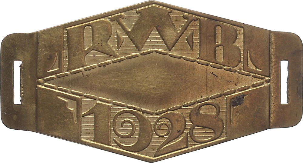 1928 Rijwielbelastingplaatje. Hoofdletters R.W.B. boven jaartal. Messing 56 x 31. JP 189. Prachtig.