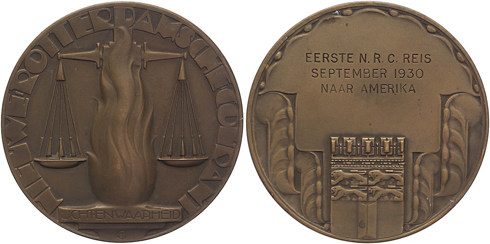 (1929) Prijspenning Nieuwe Rotterdamsche Courant. Vlam tussen weegschaal. / Drieregelige inscriptie boven Rotterdams stadswapen: EERSTE N.R.C. REIS SEPTEMBER 1930 NAAR AMERIKA. Æ 60. KB III-367; JP 215. Prachtig.