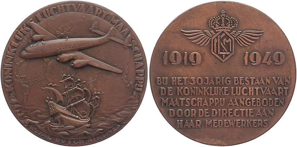 1949 Koninklijke Luchtvaart Mij. 1919-1949. Vliegtuig boven oude driemaster. / Opschrift met oud KLM-logo. Æ 60. Maarten Pauw. Prachtig.