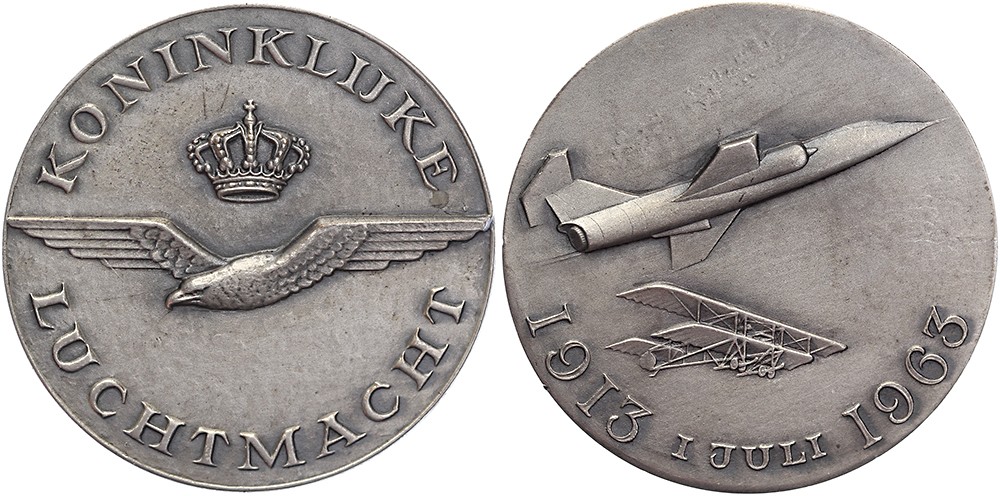 1963 50 Jaar Koninklijke Luchtmacht. Vliegende adelaar onder koningskroon. / Starfighter en dubbeldekker. AR 50. KB VI-2810. (Marinus Kutterink). Prachtig.