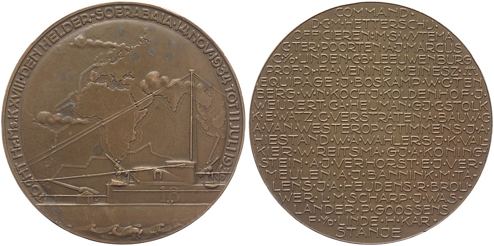 1935 Voltooiing zeereis Soerabaia-Den Helder, onderzeeboot Hr. Ms. K. XVIII. De K. XVIII voor plattegrond met afgelegde route. / Namen commandant, officieren en bemanning.Æ 50. KB V-890; JMP 1936, pag, 86, nr. 293 noot. M. Kutterink. Lichte spotjes vz. Prachtig.