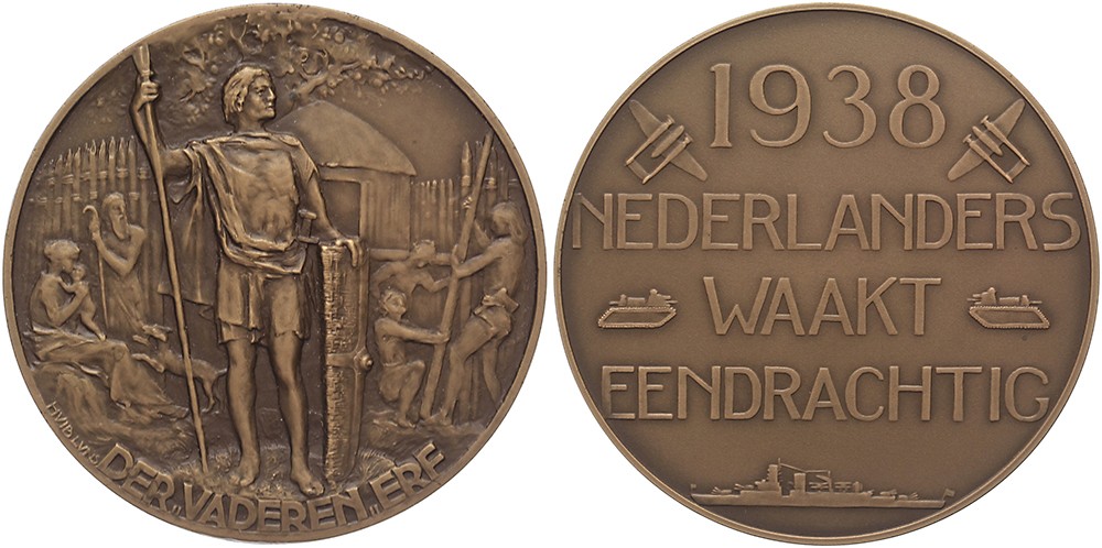 1938 Der Vaderen Erf. Staande krijger met speer en schild bij Batavierendorp. / Opschrift tussen bommenwerpers, oorlogsbodem en tanks. Æ 60. KB V-1222. Huib Luns & (G. Brinkgreve). Prachtig.