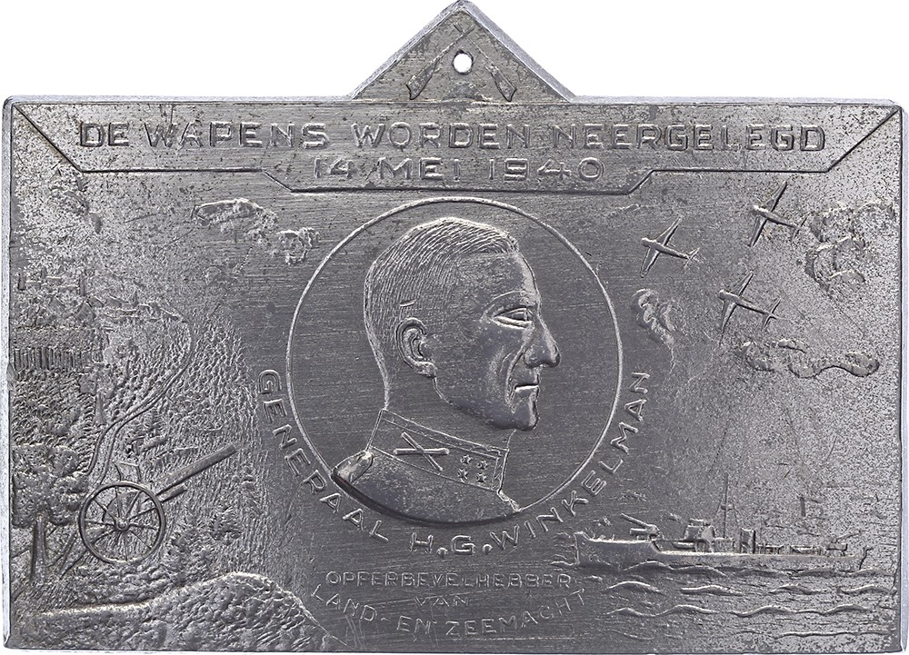1940 Capitulatie van Nederland. Buste generaal Winkelman naar rechts in medaillon omgeven door oorlogswapenen. / Glad. Zink/tinalliage gegoten 66 x 105,5. JPM 1950, pag. 52, nr. 22. Prachtig.