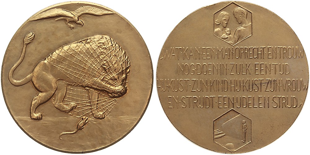 (1945) Illegalen in oorlogstijd. Leeuw, gevangen in net waaraan een muisje knaagt. Aasgier daarboven. / Vierregelig opschrift tussen medaillons met een familie en vuurpeleton.Æ 50. JMP 1950-I, pag. 59, nr. 45. (Geurt Brinkgreve). Tikje rand. Prachtig.
