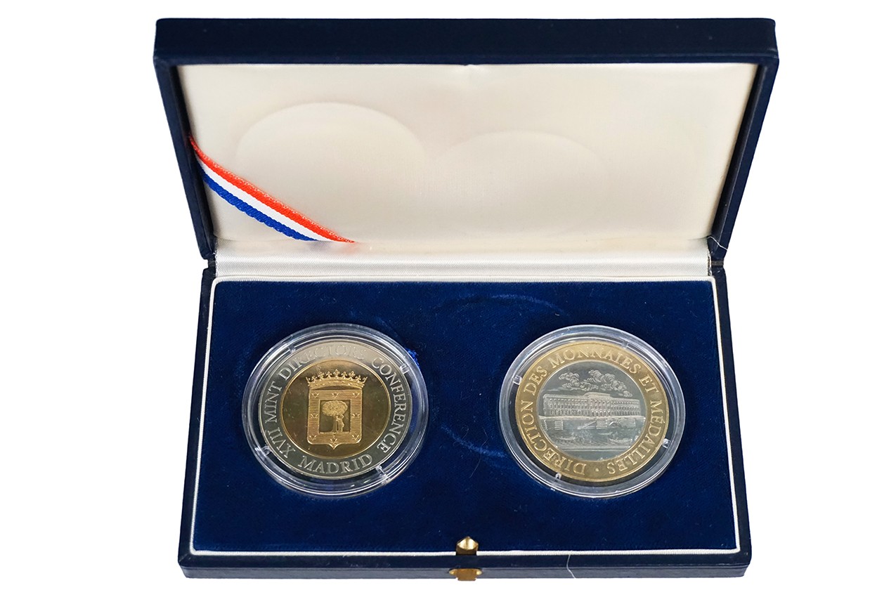 Lot (2) 1992 Madrid. XVII Mint Directors Conference. City arms Madrid. / Building and walking lion left. Bi-metal 41. Struck at ‘Le Monnaie de Paris. Original case. Unc.