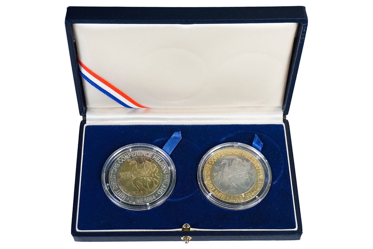 Lot (2) 1994 Helsinki. XVIII Mint Directors Conference. Swan swimming left mirrored in water. / Building and lion jumping. Bi-metal 41. Original case. Struck at ‘Le Monnaie de Paris’. Unc.
