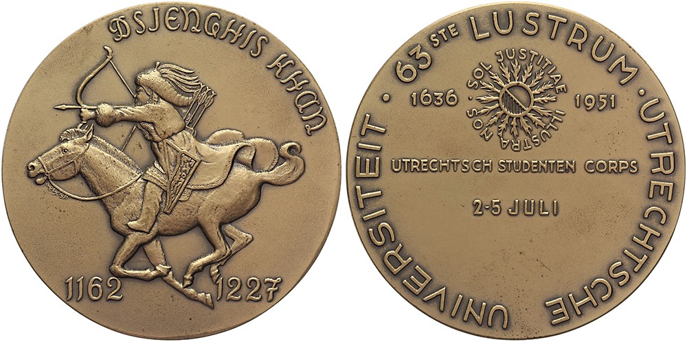1951 Utrecht, 63e lustrum – thema Dsjenghis Khan. Djingiz Chan te paard naar links. / Tekst rondom logo universiteit. Æ 60. Hofstee 37. (C.W. Broers). Prachtig.