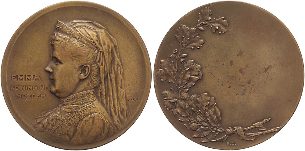 (1909) Prijs/erepenning koningin Emma. Borstbeeld Emma naar links. / Inscriptieruimte binnen halve krans van eikenbladeren. Æ 65. KB I-878. Zeer fraai.