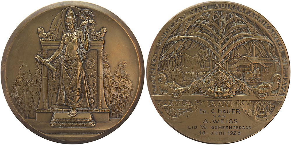 (1913) Erepenning Algemeen Syndicaat van Suikerfabrikanten op Java. Op troon staande oogstgodin met oorkonde en geluksbloem. Bloeiend suikerruit op de achtergrond. / Suikerplantage met treintje. Op naam van: ED.C. HAUER VAN A. WEISS ... JUNI 1926Æ 76. KB I-1094. Zeer zeldzaam. Licht opgewreven. Prachtig.