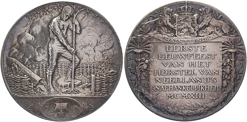 1913 Eeuwfeest herstel onafhankelijkheid. Man plant oranjeboom in Hollandse tuin. / Zevenregelig opschrift onder rijkswapen. AR 66. Bax 17c. Prachtig.