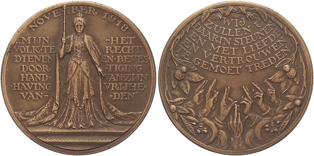 1918 Betogingen tegen de revolutie. Staande Wilhelmina in vol ornaat op bordes. / Zeven handen die de eed zweren. Æ 60. KB I-1302. Zeer fraai.