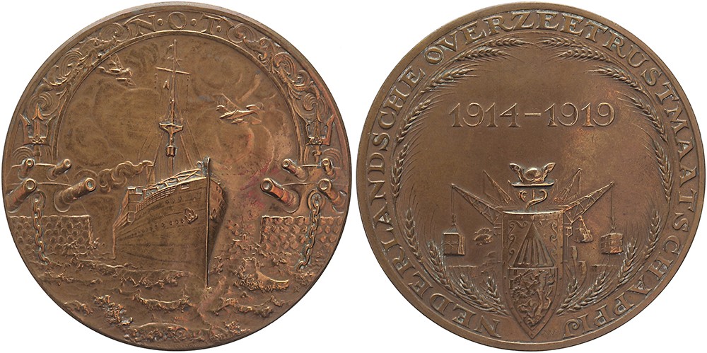 1919 Opheffing Nederlandsche Overzee Trust Mij. Stoomschip vaart door engte bewaakt door forten met kanonnen. / Wapenschild N.O.T. geflankeerd door balen, kisten, hefkranen etc.Æ 65. KB II-20. Licht opgewreven. Prachtig.