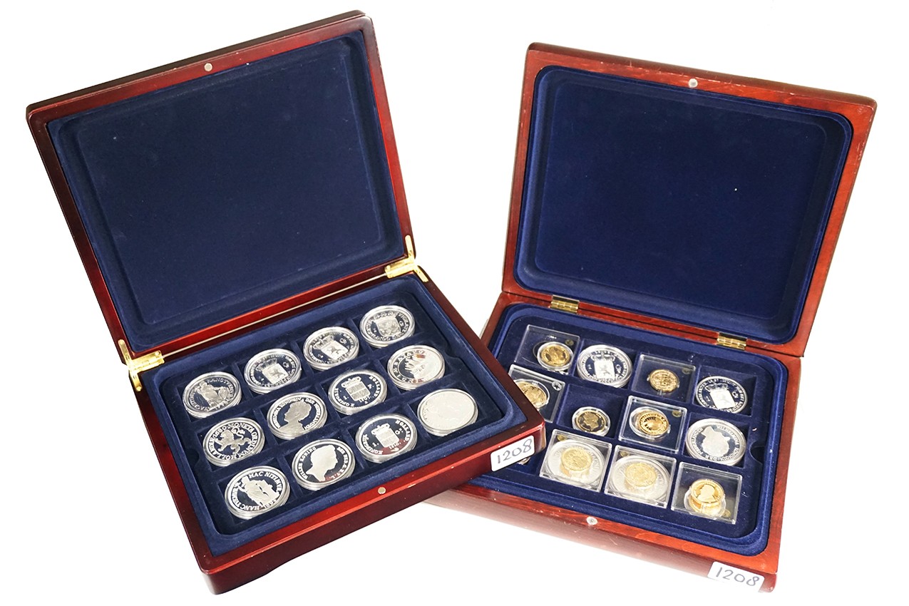Twee houten cassettes met replica’s (55) van dure munten in zilver, verzilverd en verguld.