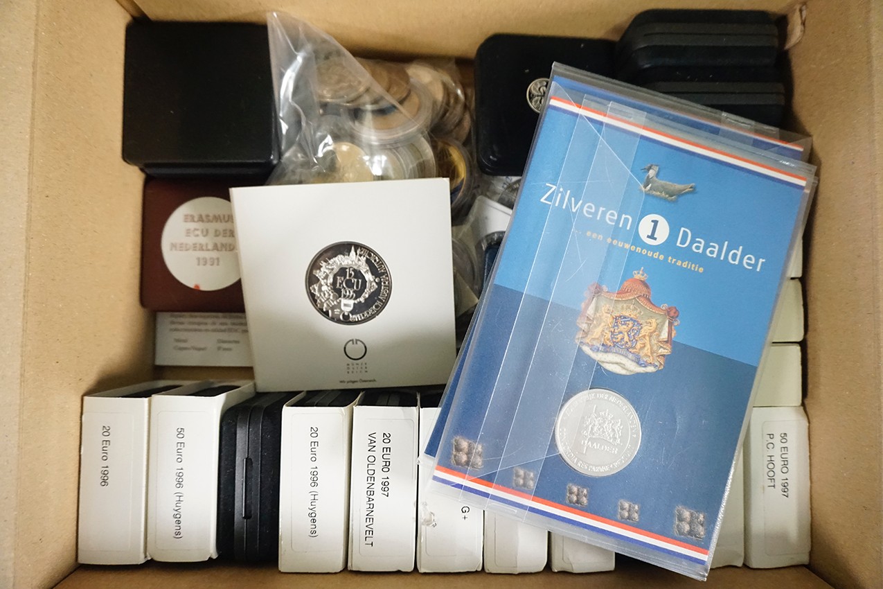 Doosje met veel fantasie ecu’s/euro’s. Tevens enige fantasie ‘Daalders’ en moderne zilveren penningen vervaardigd bij ’s Rijks Munt. Netto zilver: circa 420 gram.