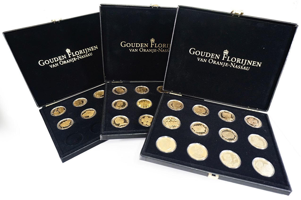Drie zwarte cassettes “Gouden Florijnen van Oranje-Nassau” met 30 vergulde bronzen penningen betreffende het Oranjehuis.