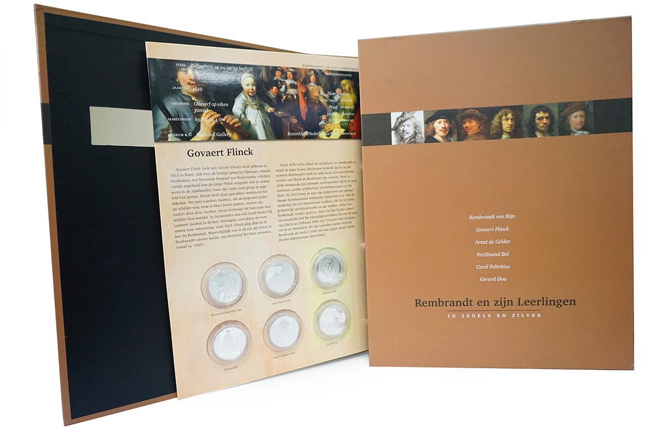 Fraaie bruine band “Rembrandt en zijn Leerlingen” met 36 zilveren penningen en 140 x € 0,39 postzegel. Uitg. Muntpost, Elst. Netto zilver: 273 gram.