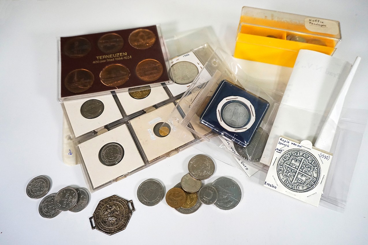 Doos met vnl. modern penningspul, zeer uiteenlopend van aard. Ondermeer de uiterst zeldzame 1 euro uit 1971.