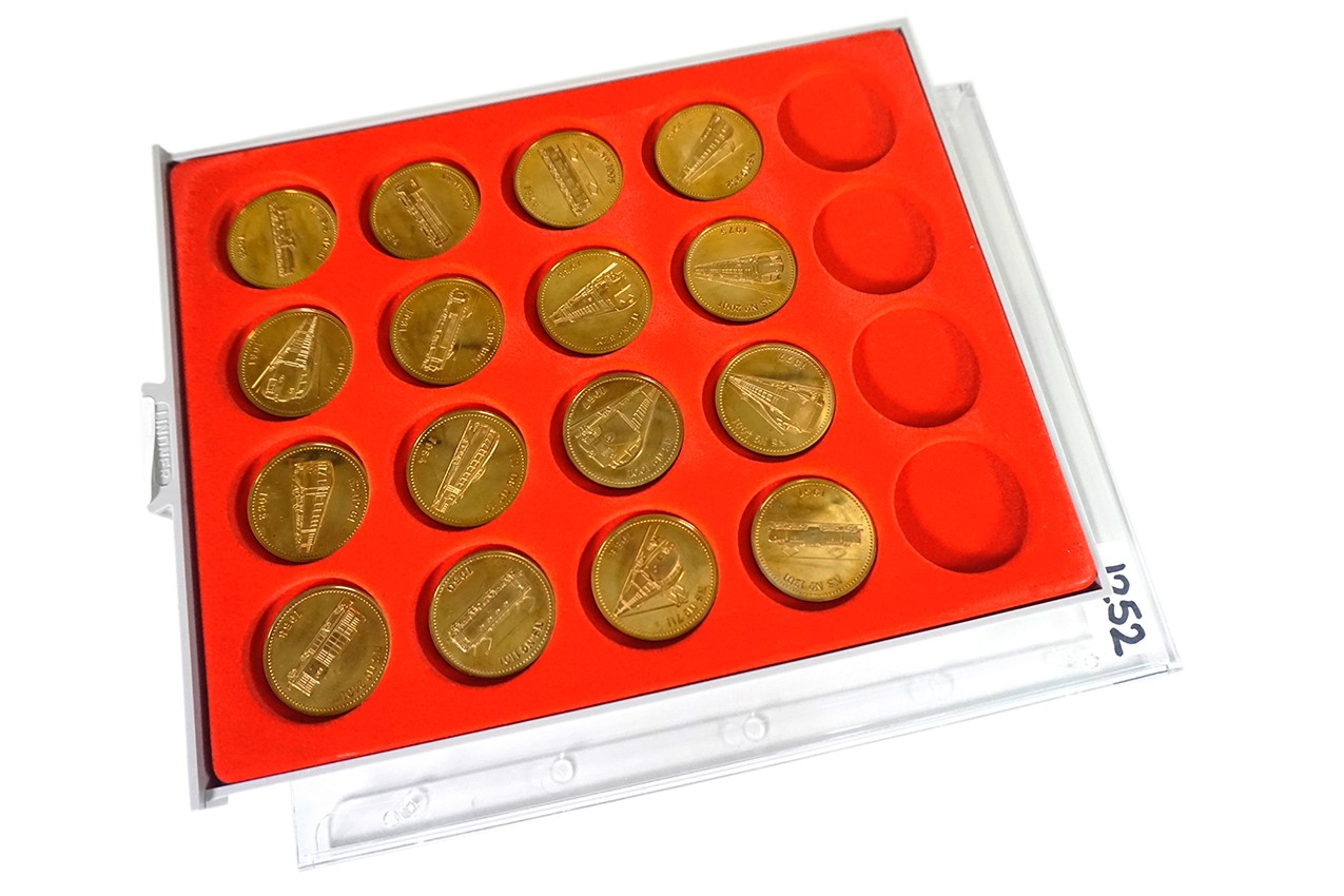 Lindnertableau met 16 vergulde bronzen penningen (Ø 41 mm.) “150 Jaar Spoorwegen in Nederland 1839 – 1989”. Beroemde locomotieven en treinstellen passeren de revue, zoals de ‘Hondekop’ (Materieel ’54); de ‘Blauwe Engel’ (Plan X) enz. enz.