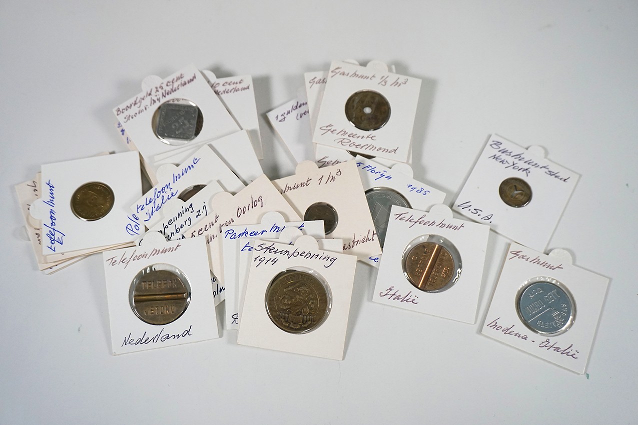 Blikje met 30 onuitgezochte penningen o.a. boordgeld, Ministerie van Oorlog en broodkaarten en diverse gasmunten.