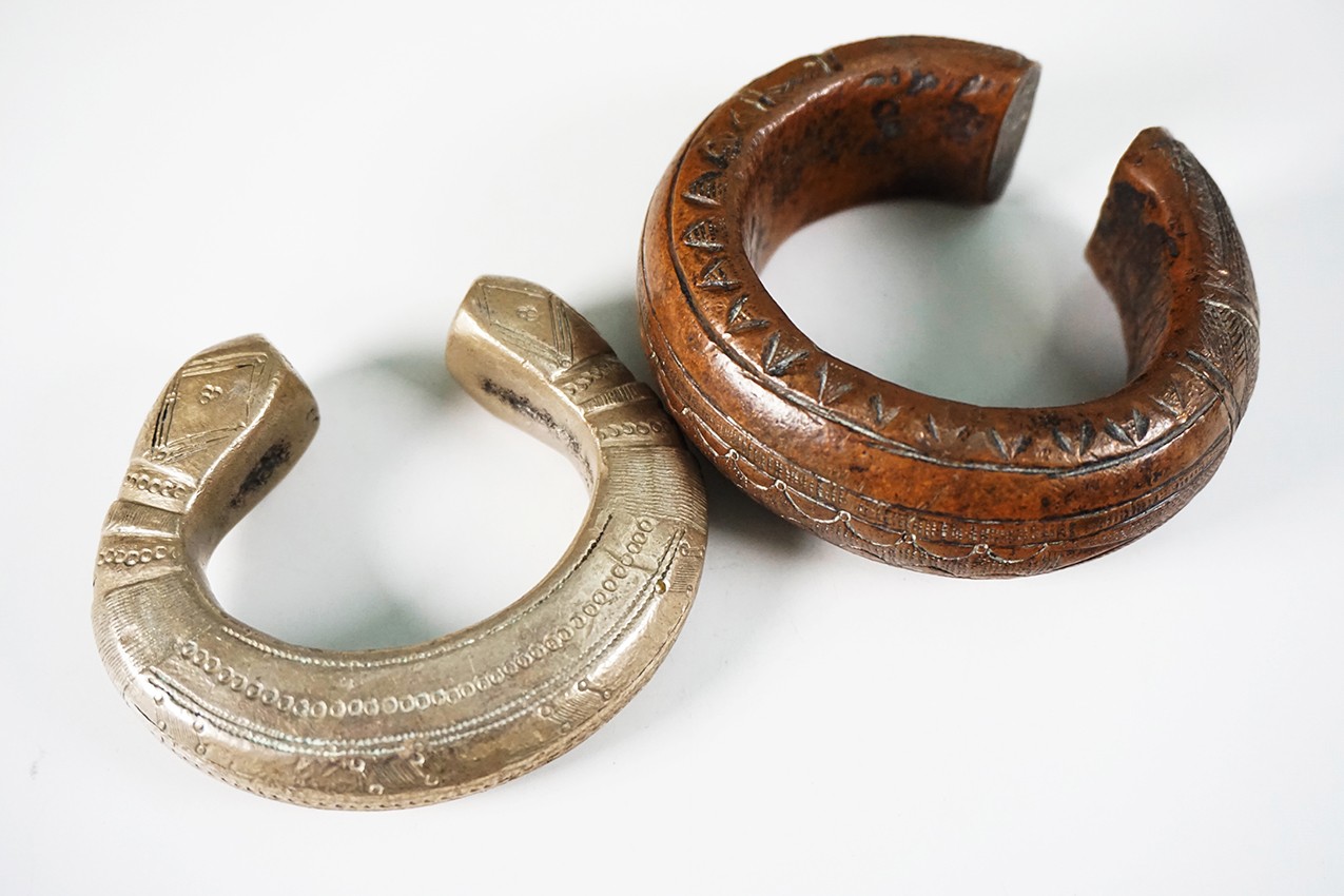 Blikje ‘Karel I’ met een bronzen en zilveren armband West-Afrika (z.g. Manilla).