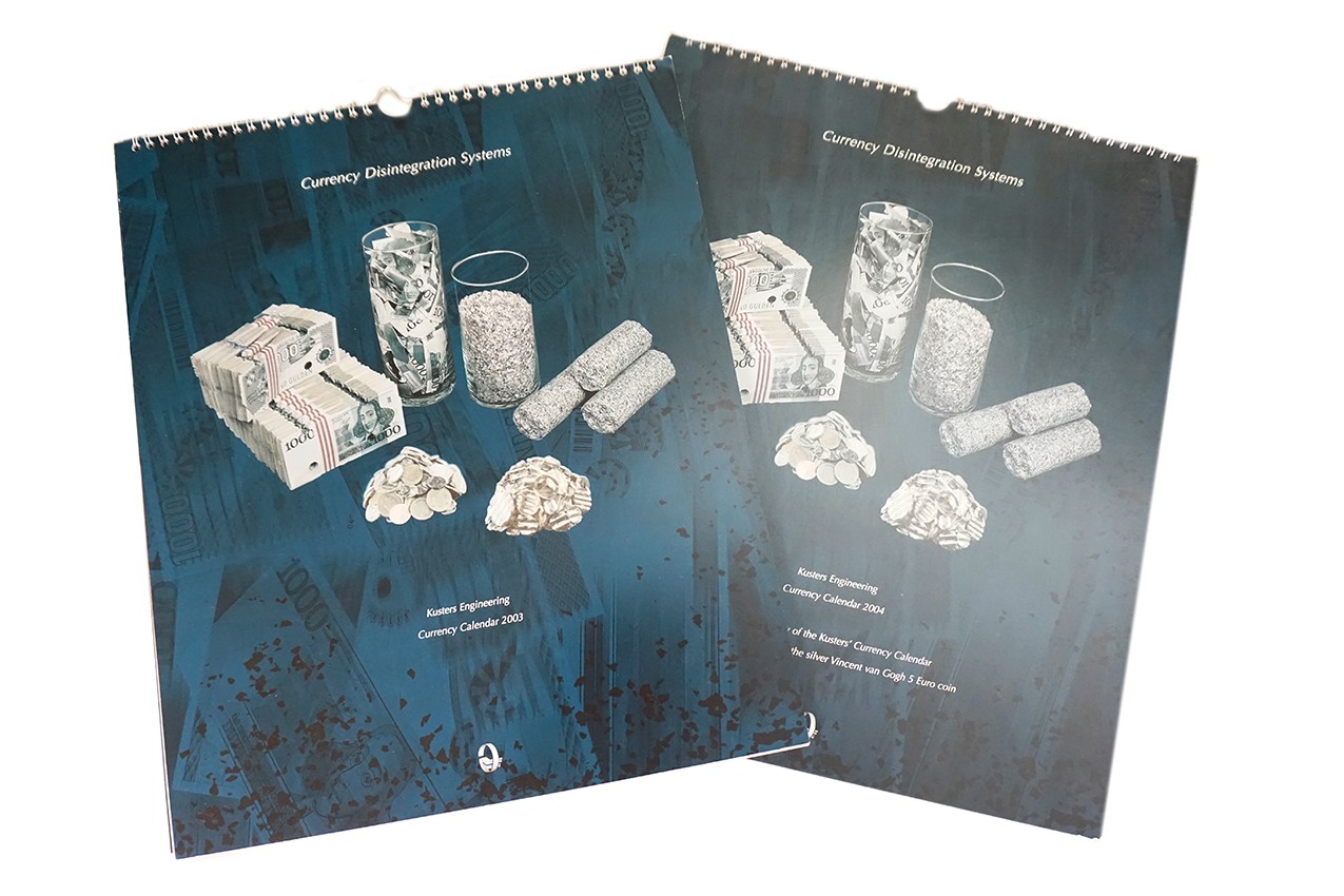 Kusters Engineering Currency Disintegration Systems, Currency Calenders 2003 en 2004 (special edition) met 5€ van Gogh munt 2003. Elke kalender met 12 UNC Bankbiljetten (wereld). Totaal 24 verschillende biljetten en 1 munt.