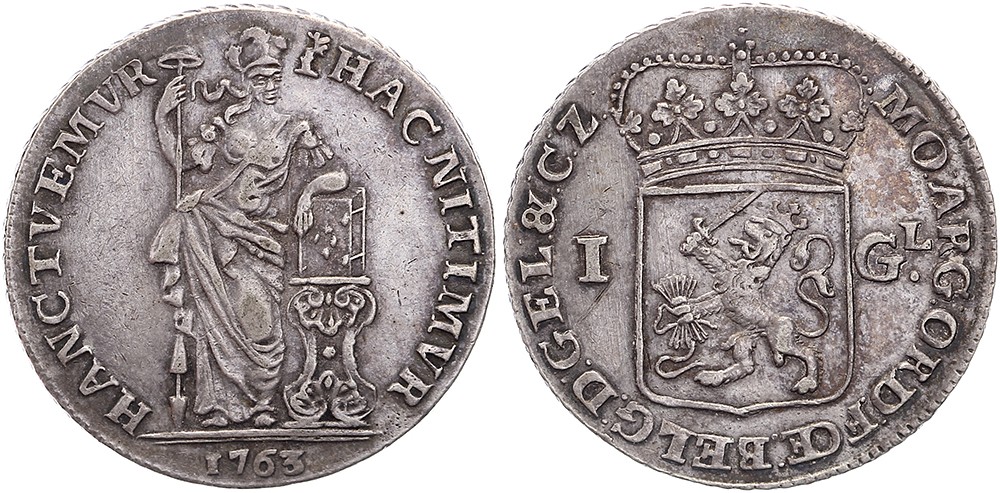 1 Gulden 1763. Delm. 1178; CNM 2.17.155; HPM 88. Mooi patina. Zeer fraai.