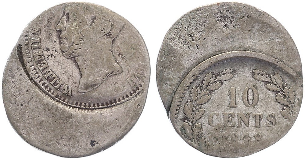 10 Cents 1848. Misslag, circa 40% off-centre, 1,32 gram. Tot op heden ons onbekend en enigszins gelijkend op de rijksdaalders zoals Jacques Schulman ze in zijn handboek op pag. 131 heeft afgebeeld. Fraai