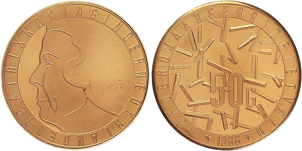 50 Gulden 1988 eeuwfeest geboorte Gerrit Rietveld. Proefslag in tombak van 38 mm. door Roberto Ruggiu. Geslagen bij ’s Rijks Munt in een oplage van ca. 60 exemplaren. FDC.