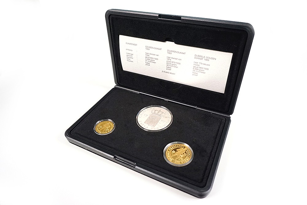 Dukatenset 1989, enkele en dubbele gouden dukaat alsmede zilveren dukaat. Proof in cassette.