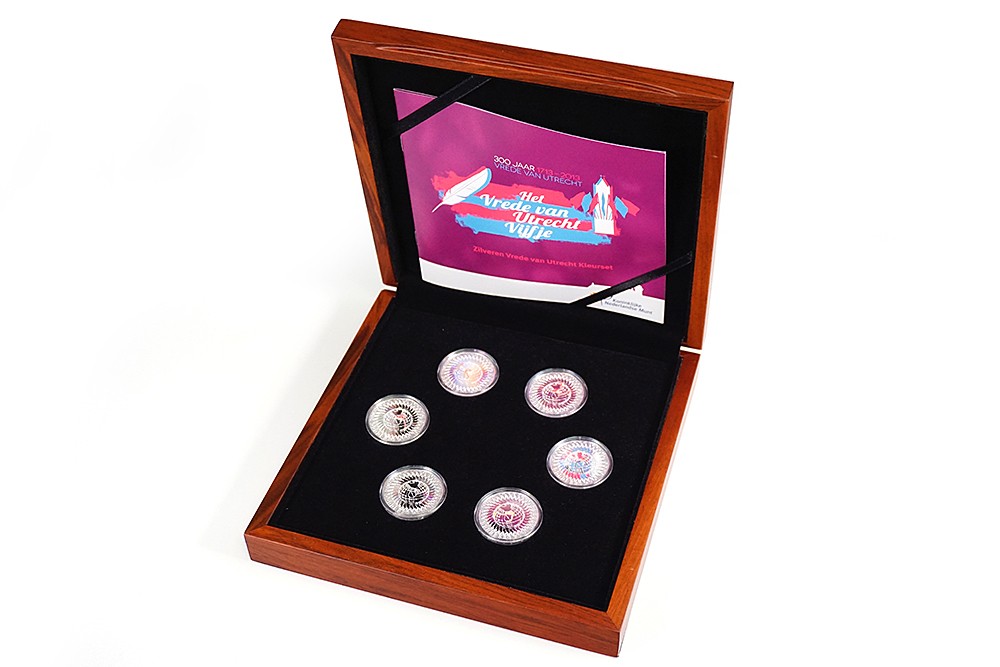 Zilveren Vrede van Utrecht Kleurset 2013, 6 x 5 euro proof ingekleurd. In originele verpakking KNM.