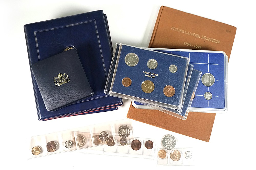 Doos met ondermeer een kistje met daarin strips van ’s Rijksmunt 1972-1975. Alsmede FDC-sets 1976-1986, proofsets 1982-1985 en 1986. Toegevoegd: Handboek van Nederlandse Munten door J. Schulman.