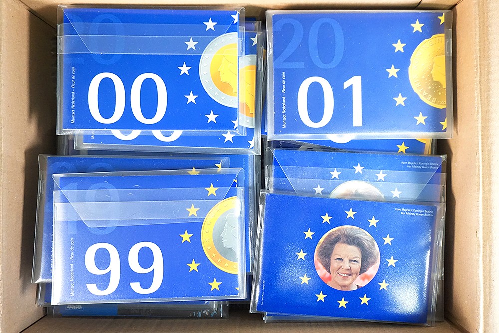 Kartonnen doos met provinciesets 1987-1998 (134) en FDC-sets 1999-2001 (38). Totaal: 172 sets.
