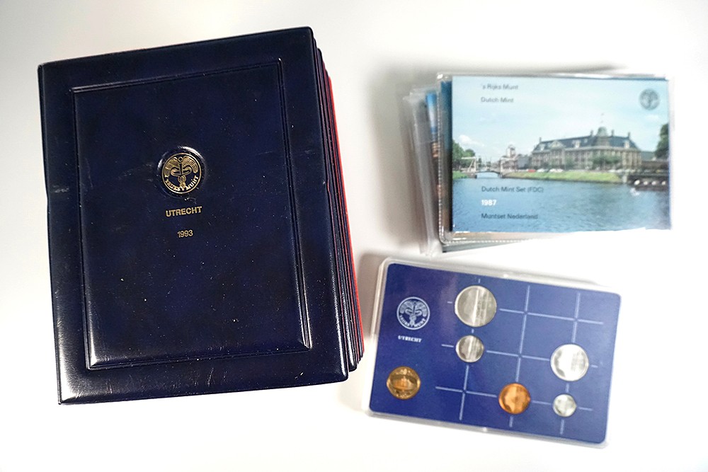 Doos (19) met daarin 10 FDC-sets Nederland (1984 t/m 1993) alsmede 9 Proofsets Nederland (1985-1987 en 1989-1993).