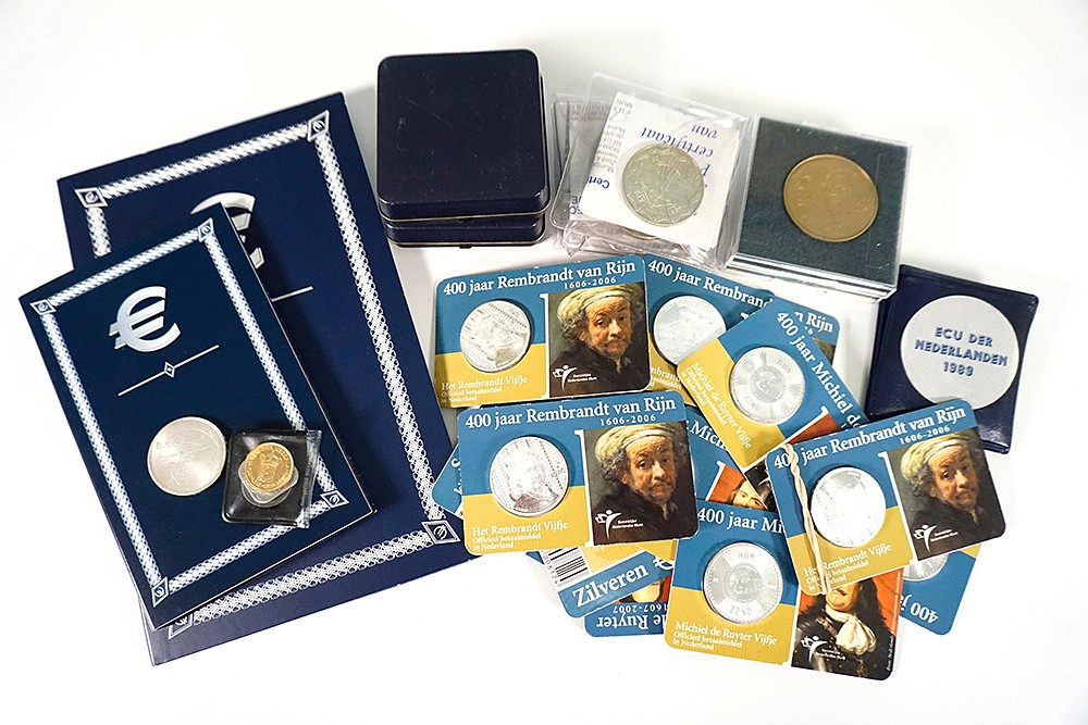 Doos met voornamelijk zilveren 5 Euro herdenkingsmunten. Aangevuld met diverse moderne penningen en voorlopers op de Euro.