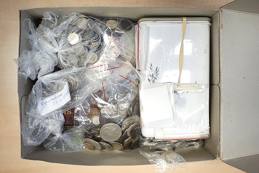 Doos koersgeld 1948-2000 Juliana/Beatrix. Tevens zakje div. koninkrijk, vnl. Wilhelmina.